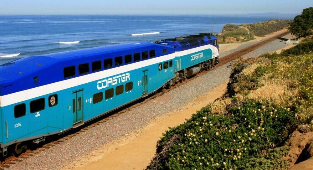 Amtrak Intercity and COASTER trains connect Los Angeles, Orange County, and coastal North County to downtown San Diego, with stops in Old Town, Sorrento Valley, Solana Beach, Encinitas, Carlsbad, and Oceanside. From Santa Fe Depot, take MTS Route 992 to the airport. COASTER runs daily, including holidays.